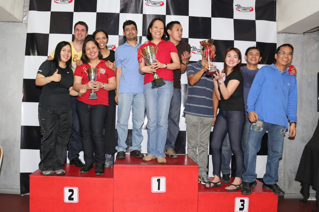 And then based on our individual times, we were grouped into 7 groups of 3/4 individuals per group. Then it was race time! The winner will be the group with the most number of laps in an hour. And each driver is only allowed to drive for not less than 9 minutes and not more than 11 minutes at a time. So each driver will drive twice in a span of an hour. This part I enjoyed because I didn't have a hard time driving the kart. But but but I was still slow. Good thing my teammates were good drivers. We finished 5th and not kulelat hahaha (We were 7 groups). And they were very supportive! They never let me feel that I was the slowest hahaha. They always tell me after my drive that I did a good job. My female teammate even told me some tips because she was the first one to drive for our team, we had time to discuss on what are the speed corners and where are the braking zones. Naks! Well, not really that technical but she really did gave me some useful tips. Our team's strategy is that I will be the last one to drive for the first and second run so that we can limit the seat adjustments - both my teammates are 6-footers so the kart had to be adjusted when I go for a drive. On my first stint our team was number 1 (this is after the drive of my two teammates). I was doing well until all the drivers caught up with me. And since I was slow and I was trying to defend my position they kept on bumping my rear. One of my colleagues bumped me too hard that my kart hit the barriers, my helmet flew. My kart wouldn't start after this. I had to ask the marshall if instead of replacing my kart, my teammate will instead start from the pits with a new kart which is what we did. I think we were 6th when I was replaced by me teammate. My teammates again were able to catch up but after my second stint, we ended up as 5th. Most of the teams had a different strategy, their last drivers were the fastest one so that they can catch up with all the other teams. I wanted us to do the same but both my teammates were like, "It's okay, don't worry, we'll do okay." Which is actually a good thing because it took the pressure off my back. I was relieved that we were 5th. I thought we were 7th after my second drive. Whew!